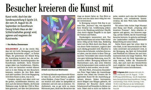 Die Video-Animation will den Betrachter unter anderem auf die Relation zwischen Zeit und Licht aufmerksam machen. Der Freiburger Künstler präsentiert eine weitere Arbeit in der Auslage der Karl-Apotheke: Die Installation „7 Antikörper” besteht aus drei grünen, drei gelben und einem roten „Antikörper”. Jeder einzelne besteht aus einer Aluminiumkugel, in die 18 fluoreszierende Acrylglasstäbe eingeschraubt sind. Das Acrylglas nimmt selbst geringste Mengen Tageslicht auf und leuchtet kräftig. Nachts wird die UV-Strahlung über eine Schwarzlichtquelle erzeugt – dann wirken die „Antikörper” noch lebendiger.